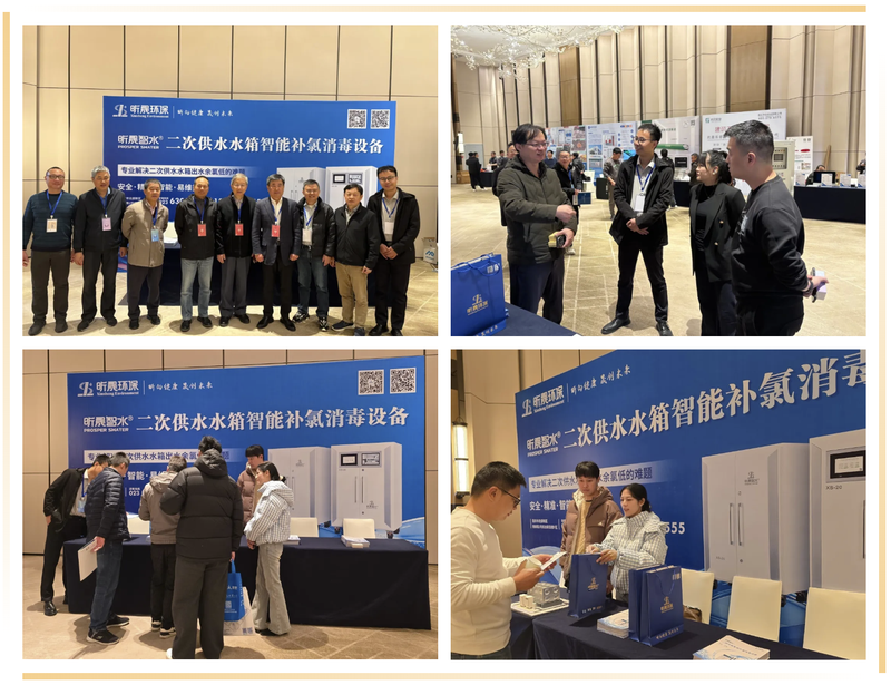 展會現場,昕晟環保的展位吸引了大批行業內的專家、學者和技術人員前來交流探討。我們也為大家詳細講解并展示了公司明星產品——昕晟智水?二次供水水箱智能補氯消毒設備的產品優勢與特點、工作原理,并結合豐富的應用案例和應用數據,幫助大家更好地理解與認識昕晟補氯設備在實際場景中的運用。能在無人值守的情況下全程智能化的保障水箱出水余氯始終維持在要求濃度以上,既有效抑制細菌滋生,又避免了補氯過量。大家對于該項新技術、新產品也給予高度認可。同時,二供水箱智能余氯管控技術為建設水系統性能提升提供了有力支持,填補了國內二次供水水質安全管理的市場空白,滿足城市二次供水水質安全保障的需求。